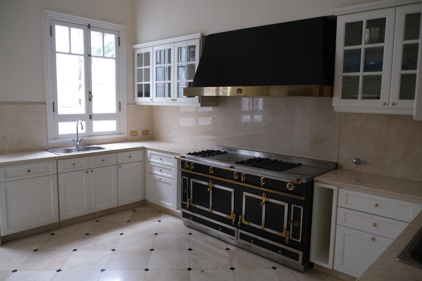 Amplia cocina francesa de la Cornue con grifería y bachas de cristal de roca y bañadas en oro, mesada de mármol, heladera y cava de Subzero.